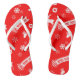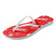 Um par de chinelos com uma repetição branca e contínua de elementos de Natal - meias, gingerbreadman, flocos de neve, renas, Enfeites de natal, velas, árvore de Natal e as palavras "Feliz Natal" - a título ilustrativo, contra um fundo vermelho.