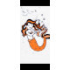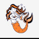 Uma ilustração branca de uma sereia com cabelo laranja fluente e uma cauda laranja vibrante. Ela parece estar brincando trazendo o cabelo, rodeada por algumas bolhas que somam ao ambiente submarino, as linhas são ousadas e cartoonistas.