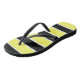 Par de chinelos listrados de preto ousado, amarelo canário e branco impecável para qualquer ocasião.