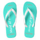 Cor de turquesa brilhante com Bridesmaid em texto branco. O nome e a data do casamento são corais bonito. Personalize cada um dos nomes das suas damas de honra em letras maiúsculas arquivadas. Clique em Personalizar para aumentar ou diminuir o tamanho do nome para cair dentro de linhas seguras. chinelos bonito de destino de praia como parte dos favores de festa de casamento que eles certamente amarão. Designs originais por TamiraZDesign.