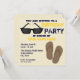 Um convite de aniversário do verão que caracteriza uma ilustração de um par de óculos de sol pretos no superior esquerdo e de um par de chinelos marrons no fundo certo. Personalize o texto amarelo e azul escuro com detalhes de sua ocasião.