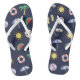 Chinelos casuais azuis escuros com colagem colorida de praia ilustrada.