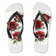 Um par de chinelos com rosas vermelhas vibrantes contra um fundo branco.