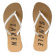 Voando na praia ou na piscina? Este par de chinelos o ajudará a sinalizar seu status para o dia, ou talvez simplesmente seu humor. É uma SOLTEIRO ou PEGADO, mas você pode personalizar facilmente o texto em ambos os calçados, talvez você queira que ambos os calçados digam que você foi pego, ou talvez você possa preferencialmente sinalizar um SIM ou NÃO, que pode ser útil em muitas outras situações. O plano de fundo do ouro de gradiente não pode ser ajustado, mas existem chinelos semelhantes com diferentes cores de gradiente.
