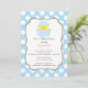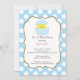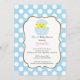 Um convite doce do chá de fraldas do menino do pintinho da páscoa que caracteriza um pintinho bonito do bebê ajustou-se em um fundo azul e branco das bolinhas. Aperfeiçoe para um chá de fraldas do bebé do tempo da páscoa. Produtos de harmonização também disponíveis em nossa loja em www.celebrateitinvites.com. ©Zenware