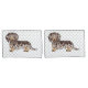 A ilustração original de um desenho animado de cabelo comprido e bonito, chocolate castanho e casaco de maçã bronzeada, cão da raça Dachshund. O fundo tem um padrão de pegadas de cinza.