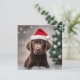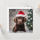 Um cachorrinho de chocolate bonito, Labrador, vestindo um chapéu de Papai Noel.