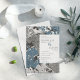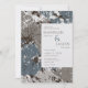 Estes convites para casamento de 5" x 7" apresentam um design de folha abstrato em tons de ardósia azul, taupe e chocolate com espaços reservados, "Junto com as suas famílias, por favor juntem-se", a noiva e o noivo primeiro e sobrenomes, "para o seu casamento," data, hora, localização do casamento e endereço, "recepção a seguir."