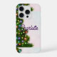 A phone case featuring a Christmas tree design on the left side, adorned with colorful lights. The background is a gradient of light pink and white with subtle bokeh effects resembling snowflakes. The name "Charlotte" is written in a cursive font across the center of the case.