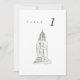 Cartões de número de casamento em chic, com pintura a cores da mesa de Nova Iorque, edifício Chrysler. O emparelhamento da aquarela pareada com a tipografia quic faz uma combinação maravilhosamente divertida.