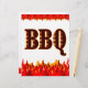 Um modelo de panfleto personalizado com a palavra CHURRASCO em letras flamejantes ocidentais com arte gráfica de chamas vermelhas e laranja na parte inferior da design. O reverso tem espaço para suas datas de convite de festas e muito mais. Clique em Personalizar para adicionar mais texto, alterar fontes, cores de fundo e muito mais.