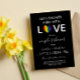 Convite encantador para chuveiro de casal lgbt com coração orgulho arco-íris em vamos chover eles com amor contra um fundo preto.