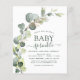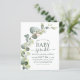 Convites de Chuva de Bebê com Eucalipto Econômico, Folhagens e Suculentas, Botânico Aquarela, Primavera, Neutro em Gênero para Bebê Menino ou Bebê Menina - inclui tipografia elegante e bonita com folhas botânicas modernas e folhagens para a celebração especial da futura Mãe, em fundo branco.