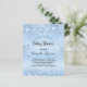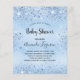 Para uma chuva de bebê, celebrando um menino. Um fundo metálico falso azul claro. Decorado com pó de brilho falso. Modelos para o nome da futura mamãe e detalhes da festa. O nome e o texto: Chuva de Bebê estão escritos com um estilo de letra manuscrita