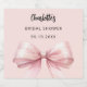 Um fundo cor de rosa avermelhado. Decorado com um laço grande. Personalize e adicione o nome da noiva e uma data. Tipo de letra manuscrito preto.
