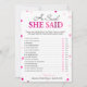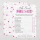 Este jogo de bingo moderno apresenta um fundo magenta rosa com confetes metálicos. O texto é escrito em uma mistura de uma fonte de caligrafia divertida e uma fonte serifada moderna, este cartão é personalizado com o nome da Noiva e a data do Chá de Panela.