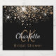 Para uma chuva de presentes de noiva elegante. Um fundo preto chique com manchas de brilho dourado falso. Personalize e adicione um nome e iniciais de monograma. O nome é escrito em uma cor dourada com um estilo de letra manuscrita moderna. Letras brancas e douradas.