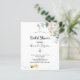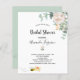 Um convite para uma noiva. Um fundo branco chique. Decorado com flores brancas pintadas à aguarela (peônia) folhagens de eucalipto, folhas e raminhos, e uma abelha feliz sorridente carregando um envelope. Personalize e adicione um nome e detalhes da festa. Letras pretas. O texto: Chá de Noiva e o nome da noiva são escritos com um estilo moderno de letra manuscrita.