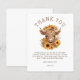 Chuva de Sol Grata Chuveiro de Bebê Vaca das Terras Altas Obrigada. Uma alternativa menor de 4,5 x 5,6” a um preço acessível em semi brilho 110gsm semelhante em espessura a um cartão postal. Há UM por folha. Vibrações boho e doçura de animal de fazenda para o seu obrigado. Personalize facilmente o texto conforme necessário e altere as cores do texto e do fundo, se desejar, através da opção editar mais