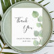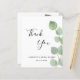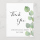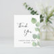 Um cartão de agradecimento para um Chuveiro de Noiva. Um fundo branco elegante decorado com folhagem de eucalipto. Na frente, uma grande letra manuscrita preta e o texto: Obrigado, você e uma data. Costas: Personalize e adicione sua nota de agradecimento e nome.