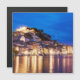 Pintura da cidade de Sibenik na Croácia. Cidade iluminada com fortaleza, edifícios antigos, mar e céu azul. Porto de Sibenik, Croácia à noite, vista à hora azul na Rua.