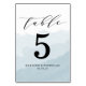 Cartões de mesa de casamento elegantes, com um fundo azul de lavagem a aquarela, com letra de caligrafia à mão. Personalize os cartões numéricos da tabela na moda com seu nome e data de casamento para uma aparência personalizada.