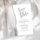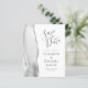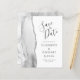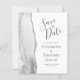 A borda esquerda deste elegante casamento moderno salve o cartão de data com uma cinza e uma aquarela branca, aparada com falso brilho prateado. O texto personalizável combina a escrita manual de cinzas de carvão, as fontes em copperplate e itálico em um fundo branco. O verso apresenta uma cinza e um design prateado.