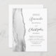 A borda esquerda deste elegante convite de casamento moderno apresenta uma cinza e uma aquarela branca, aparada com falso brilho prateado. O texto personalizável combina o script de cinza de carvão e as fontes sans serif em um fundo branco. O verso fornece espaço para detalhes do casamento em um fundo branco sólido, junto com um código QR que os convidados podem digitalizar para visitar seu site e RSVP, o que economiza o custo de imprimir e enviar cartões RSVP separados.