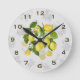Bonito relógio brilhante da parede da cozinha com limões e um fundo de desenhos de fruta de cinza leve. Faz um belo presente para o lar. (Paleta de mesa, caneca de café e toalha de cozinha.)