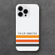 capas de iphone com três faixas horizontais em cinzas escuras e dois tons de laranja e seu nome personalizado em uma fonte ousada e moderna sans serif.