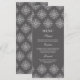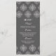 Este menu de comida de casamento na moda tem uma elegante cinza de pérola / fundo prateado escuro com um design damask branco flocos de neve no topo e no fundo. No meio, você pode personalizar facilmente isso com o menu.