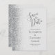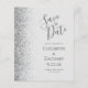 A borda esquerda deste elegante casamento moderno salve o cartão de data apresenta uma borda cintilante. O texto personalizável combina a escrita manual de cinzas de carvão e as fontes de impressão em um fundo de cinza pálido. O verso apresenta uma cinza e uma design prateada correspondentes.