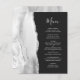 A borda esquerda deste elegante cardápio moderno de casamento apresenta uma cinza e uma aquarela branca aparada com falso brilho prateado. O texto personalizável combina o script de escrita manual de cinzas prateadas brancas e as fontes em um fundo preto de ardósia. O verso apresenta uma cinza e um design prateado.