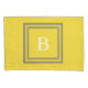 Esta fronha de almofada amarela tem um grande monograma branco que seja limitado por quadrados cinzentos e amarelos.