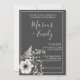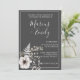 O design convite de casamento moderno e dramático apresenta tons brancos/neutros de aquarela canto floral sobre a cinza de papoila com blocos de texto personalizáveis brancos em fontes modernas