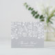 Estas notas de cinza prateada agradecidas são um excelente valor impresso em papel de 110 lb e apresentam um padrão de folha branca, as palavras "Obrigado" e o seu nome em letras brancas chic na frente e a sua mensagem pessoal no verso. Muito obrigado, anotações para seu casamento, chá de panela, chá de fraldas, aniversário, aniversário, formatura ou qualquer evento especial. Os envelopes brancos são opcionais. Mede 4,5" x 5,6", mas você pode escolher entre 3 tamanhos de papel. MAIS CORES na nossa coleção.