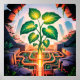 Uma planta brilhante atravessa pedra e circuito, alimentada pela luz e conectada por raízes. Este design inspirado no solarpunk celebra a resiliência, a renovação e a força silenciosa da energia verde que se instala num mundo fraturado.