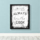 Uma arte na parede da cozinha canvas tem um humor fofo de citação tipográfico no estilo rústico design com o beijo do texto do cozinheiro em tons de cinza e estilo chic rústico na borda negra. Trabalho de arte copyright Ann Powell