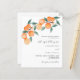 Um fundo branco. Decorados com laranjas de cor aquosa. Personalize e adicione um nome e detalhes da parte. Voltar: adicione o URL do site de casamento ao código QR para obter detalhes e/ou RSVP. 1 folha = 1 convite impresso de borda a borda.