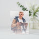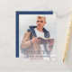 Cartões de agradecimentos de graduação moderno com uma foto vertical personalizada na frente e uma foto horizontal no verso. As palavras "Obrigado" aparecem na tipografia azul-marinho. Adicione seu nome e ano de graduação abaixo na fonte de sans serif azul marinho. Personalize o lado inverso com uma mensagem e uma linha de assinatura de sua escolha em fontes de sans brancas serif em um fundo azul marinho. Substitua facilmente as imagens de exemplo por suas próprias fotos. Uma tela de gradiente branco ajuda a garantir o texto na parte frontal das pop da placa. Ideal para segundo grau ou formandos.