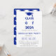 NewParkLane - Convite à Festa de formatura, com 'Classe de 2024' em tipografia azul marinho, com letras suspensas, e um boné de formatura azul. A parte de trás é azul e tem um padrão de pequenos bonés de formatura brancos. Versão 2025 disponível a pedido