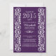 Lindo convite de graduação da classe 2015 com uma fronteira de espiral de rico vintage que enquadra seu conjunto de informações de festas de formando em um fundo roxo. Apenas personalize com as informações da sua festa e você está pronto para ir. Disponível em nosso compro em uma variedade de cores populares nas escolas. Perfeito para a graduação de meninas, graduação de garotos, formandos, graduação de segundo grau, graduação de formando ou anúncio de graduação.