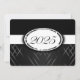 Convite à graduação em preto e branco com listras pretas claras e escuras e uma fita branca passando mostrando o ano de graduação. A parte traseira da placa é preta com fonte branca para que as pessoas preencham os anúncios de graduação.