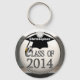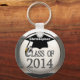Elegante, legal e elegante, cadeia de chave de graduação "Classe de 2014". "Classe de 2014" em um design gráfico de texto cor prateada em um fundo de 3 d branco e uma borda prateada correspondente (impressa, não prata real) ao redor. Adicionado a esta cadeia-chave está um boné de formatura preto com uma fita de ouro. Lembre-se do dia especial com esta corrente de chave de graduação de classe personalizada. Um olhar rico, mas barato! Personalize facilmente o nome do formando ou adicione o nome da escola para um presente de manutenção do excelente e um favor para os adolescentes, homens e mulheres formandos de todas as idades, assim como para toda a classe de formandos!