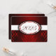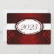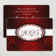 Convite à graduação de vermelho e branco com listras vermelhas claras e escuras e uma fita branca passando mostrando o ano de graduação. A parte traseira da placa é vermelha com fonte branca para que as pessoas preencham os anúncios de graduação.