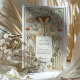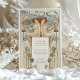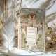 Esta bela carta de cardápio de casamento, inspirada no Art Nouveau, traz um toque de elegância vintage a qualquer evento. A frente apresenta uma ilustração de duas figuras graciosas, classicamente estilhaçadas, segurando um banquete e um copo, simbolizando abundância e celebração. Linhas deliciosas e motivos florais em tons suaves de lacre, pêssego e creme enquadram o design, adicionando um charme caprichoso. O dorso mostra um cardápio belamente apresentado com uma seleção refinada de cursos. Perfeito para casamentos, jantas formais ou encontros com temas antigos, este cartão de menu adiciona um ambiente artístico e sofisticado às suas definições de mesa.