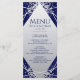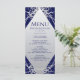 Um menu clássico com um design geométrico prateado num fundo azul marinho profundo com uma espiral de brilho prateado. Você pode adicionar seus detalhes clicando no menu personalizar. Isto é parte de uma suite de casamento clássica que inclui um convite, envelope, cartões de lugar, guardanapos e muitos outros itens.