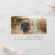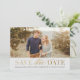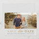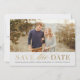 Um anúncio de salvar data com tipo clássico e caligrafia em textura de folha de ouro falsa (destinada a parecer folha, mas não é realmente folha prensada) e abertura de foto paisagem.