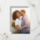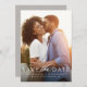 Um simples, mas elegante, salvar o cartão com fotos de data para anunciar seu noivado e o próximo casamento. A foto vertical do solteiro apresenta texto branco no fundo com bastante espaço para nomes e detalhes do grande dia.