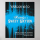 Um fundo azul elétrico manchado e manchado contra preto rico dá a esta doce poster 16 a aparência de uma boate ou de um folheto de eventos. Perfeito para os adolescentes e seus amigos que amam a vida noturna e se divertem! Uma mensagem de boas-vindas ou outra impressão no topo acima da massa azul brilhante esbranquiçada que compensa seu nome e as palavras "Doce Dezesseis" reproduzidas em um estilo de ornamentado. Use como sinal de boas-vindas para seus convidados e adicione uma mensagem especial para todos verem.Disponível em cores alternativas com produtos correspondentes.